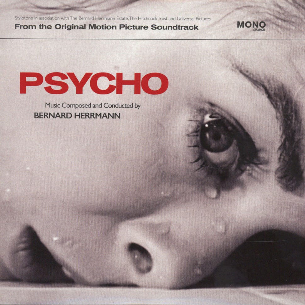 I forced myself to only bring 8 albums today, but one of them is Bernard Herrmann conducting the London Philharmonic Orchestra. In the liner notes, he talks about Psycho being the first horror film score to exclusively use strings. That creative decision was his response to the film being in black and white. The picture is limited by not using color, so he wanted to limit himself sonically. Apparently Hitchcock was very against there being any music at all during the shower scene, but Herrmann convinced him otherwise.